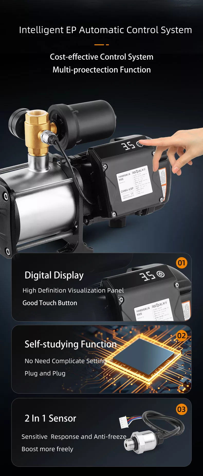 | CHM2-3/EP | 0.37 | 4.5 | 29.5 | 2m³/h@24m | 3 | 304 x 174 x 255 | 9.4 |