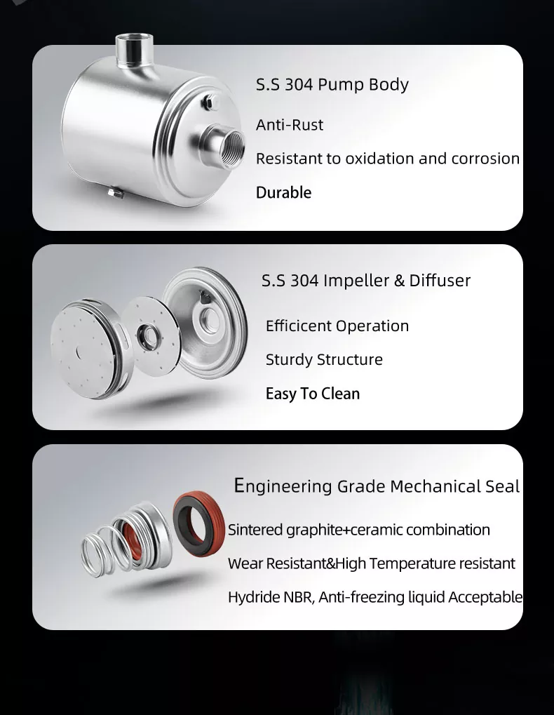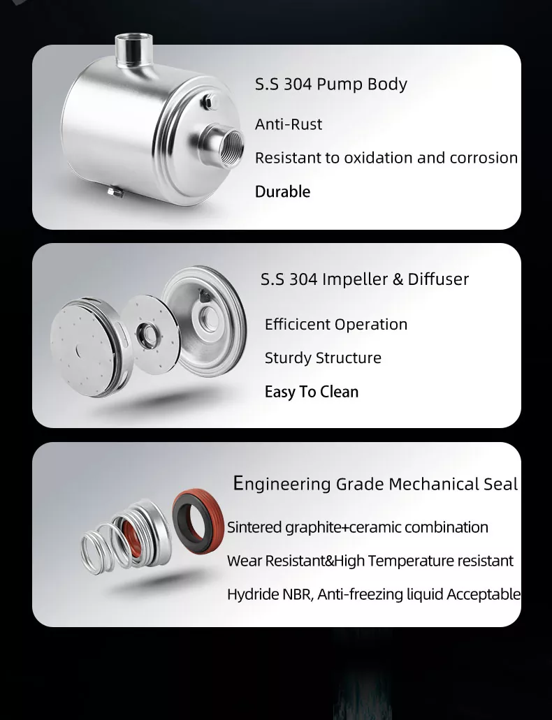 3. Všestranné aplikácie: Či už potrebujete zvýšiť tlak vody v budovách, zavlažovacích systémoch alebo priemyselných procesoch, toto čerpadlo je dostatočne univerzálne na to, aby sa ľahšie uspokojilo širokú škálu potrieb.