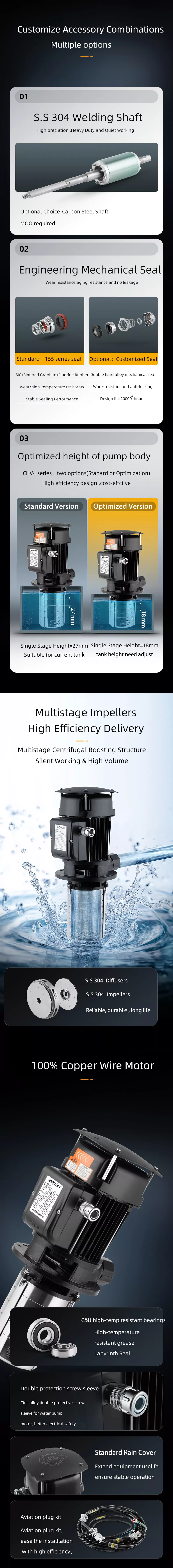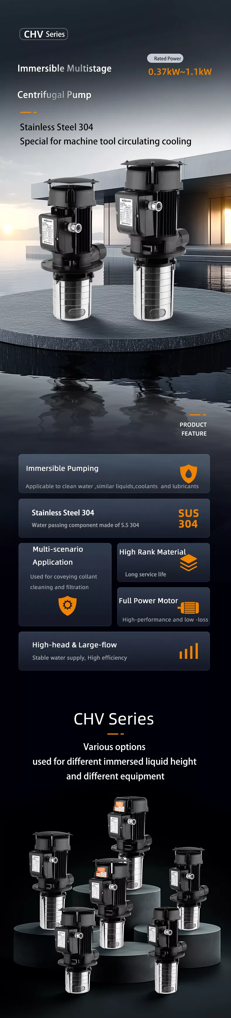 Nasleduje predstavenie radu CHV Ponorné viacstupňové odstredivé čerpadlo CHV, špeciálne navrhnuté na čerpanie chladiacich mazív pre obrábacie stroje a na montáž na vrch nádrží so zásobníkom čerpadiel ponoreným do čerpanej kvapaliny. Čerpadlá STAIRS SBK sú k dispozícii s rôznymi veľkosťami čerpadiel a rôznym počtom stupňov na zabezpečenie požadovaného prietoku, tlaku a dĺžky.
