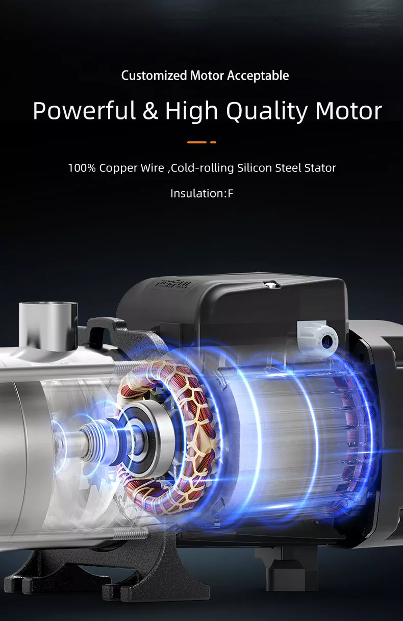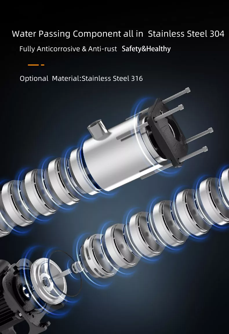 CHM8/IV Series Smart Inverter Series Series Horizontálna viacstupňová odstredivka čerpadla z nehrdzavejúcej ocele je relatívne zrelý produkt na trhu, ktorý je v súčasnosti s kompaktnou štruktúrou a stabilným pracovným, nízkym prevádzkovým šumom, evenciou až do 44 až 70%. Všetky komponenty prechádzajúce vodou sú vyrobené z nehrdzavejúcej ocele AISI304.